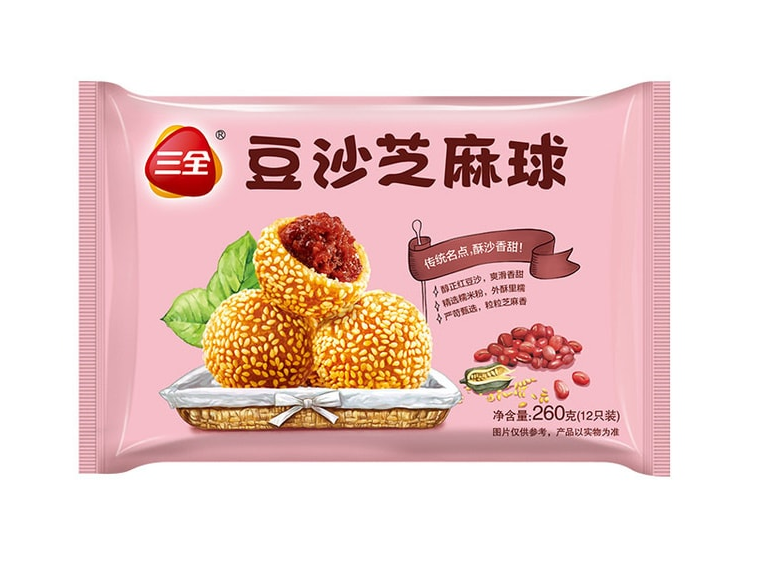 三全豆沙芝麻球。这是一种受欢迎的中国点心,由裹着芝麻的油炸糯米球制成,内馅是甜红豆沙。