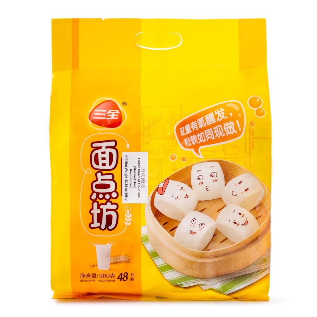 三泉冷冻蒸包(又称“刀切馒头”或刀切馒头)。这些是产自中国的原味冷冻即食包子。