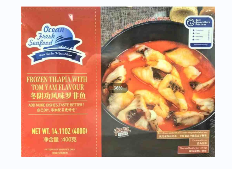这是 Ocean Fresh Seafood 出品的冬阴功口味冷冻罗非鱼。