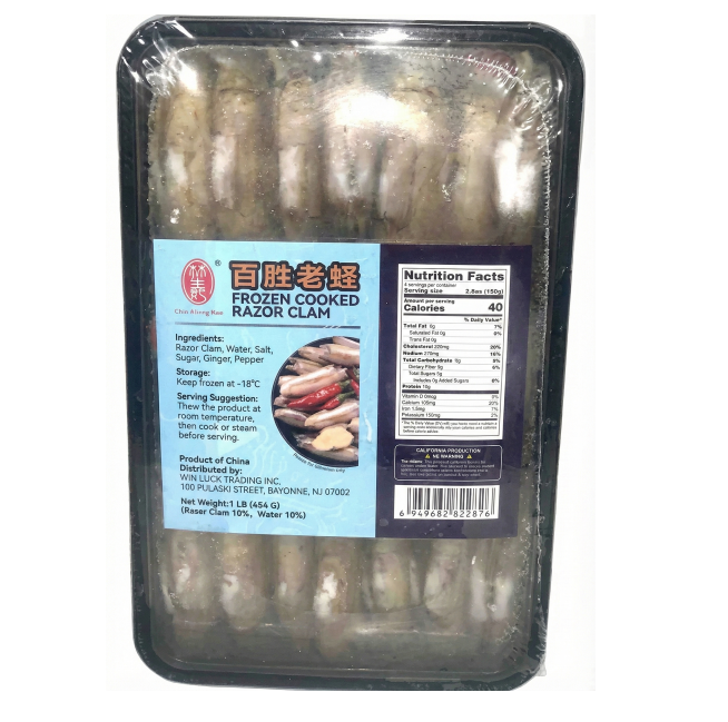 白盛冷冻老蛏,由 Win Luck Trading Inc.经销。配料:蛏子、水、盐、糖、姜、胡椒。储存方法:冷冻保存于-18℃。净重:1 磅(454 克)。每份热量:40 卡路里。