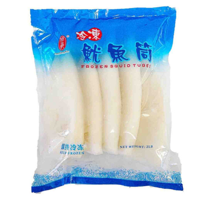 The product is “Lam Sheng Kee frozen squid Tubes”.The net weight is 2LB.The product is wild-caught and cleaned.Squid tubes are versatile and used in dishes like calamari, pasta, and stir-fries.