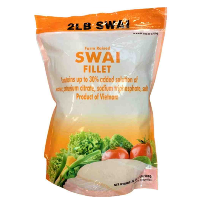 This is a 2lb bag of farm-raised frozen swai fish fillets from Vietnam. Key details include: Swai is a white-flesh fish with a mild, slightly sweet taste and a light, flaky texture. The product contains up to 30% added solution of water, potassium citrate, sodium triphosphate, and salt. It is a versatile, boneless, and skinless fish that is a low-cost protein option. Swai is suitable for various cooking methods, including baking, grilling, frying, or steaming. The net weight is 907g (2lbs).