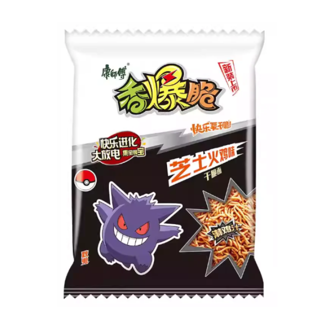 This is a Master Kong Xiang Bao Cui crispy noodle snack in Cheese & Turkey Flavor. The product is part of a collaboration between Master Kong and the Pokémon franchise