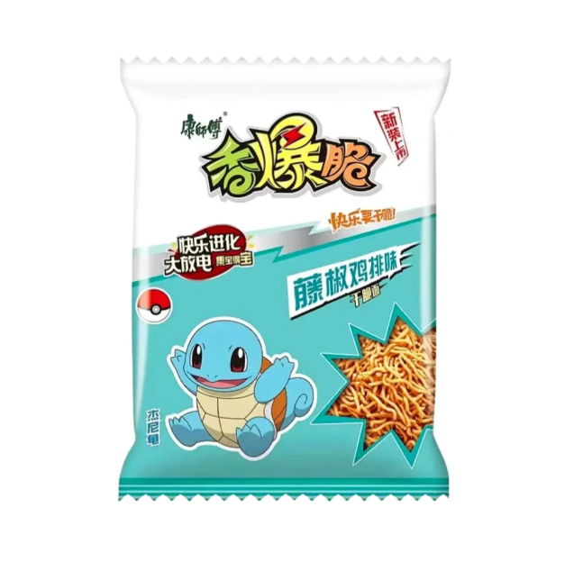 This is a Master Kong Xiang Bao Cui crispy noodle snack in Sichuan Peppercorn Chicken flavor. The product is part of a collaboration between Master Kong and the Pokémon franchise